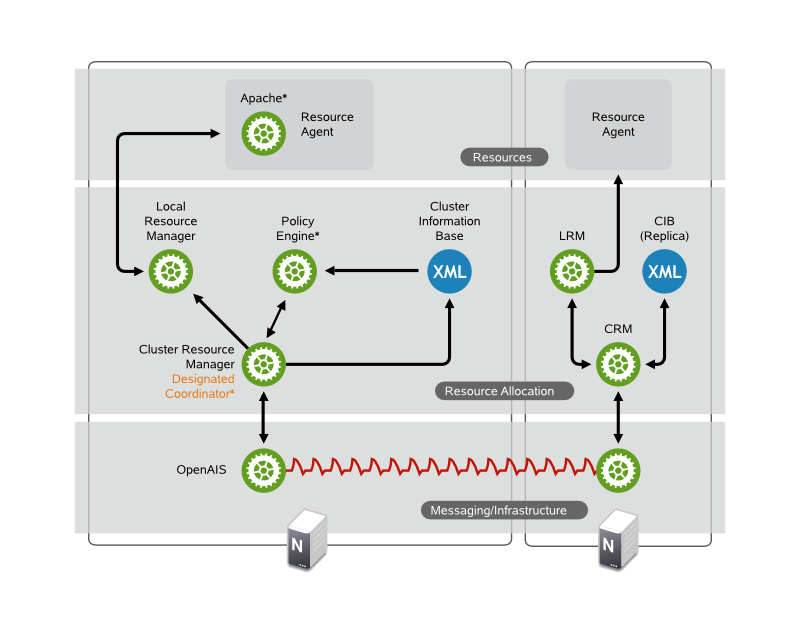 在资源分配层中执行的每个操作都要经过群集资源管理器。如果资源分配层的其他组件(或更高层中的组件)需要通讯,则它们通过本地 CRM 进行。