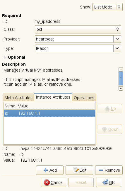 在右窗格中,选择要修改的资源并单击 (编辑)(或双击资源)。下一个窗口将显示已为该资源定义的基本资源参数和 (元属性)、(实例属性)或 (操作)。