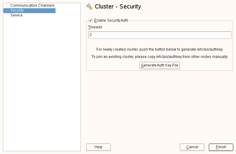 安装 HA 包后,可以用 YaST 配置初始群集设置。它包括节点间的通讯通道、安全性方面(如使用加密通讯和启动 OpenAIS 作为服务)。