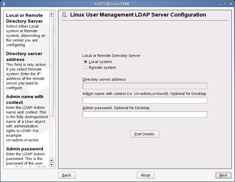 若要在 SUSE Linux Enterprise Desktop 安裝過程中安裝及設定 LUM,請在「使用者驗證方式」頁面中選取作為驗證方式,並完成下列步驟 3至步驟 10。 若尚未安裝,會提示您安裝 yast2-linux-user-mgmt 套件。