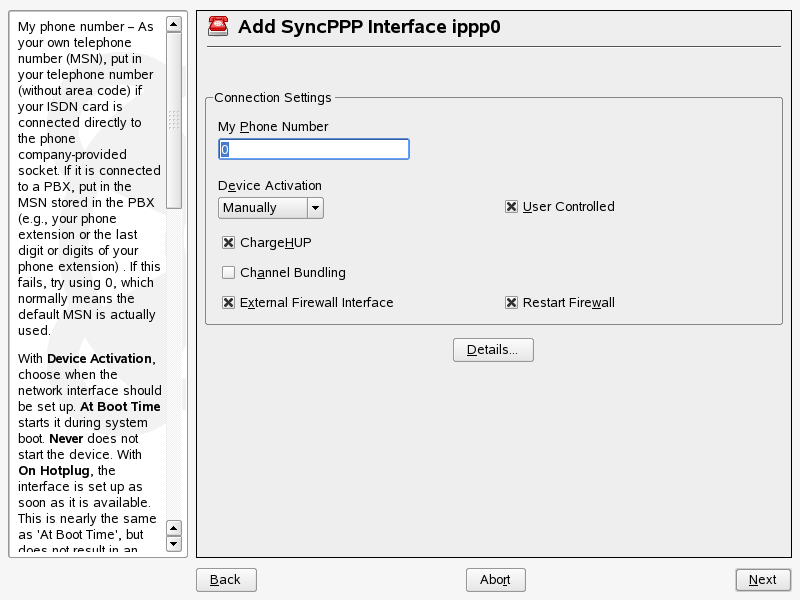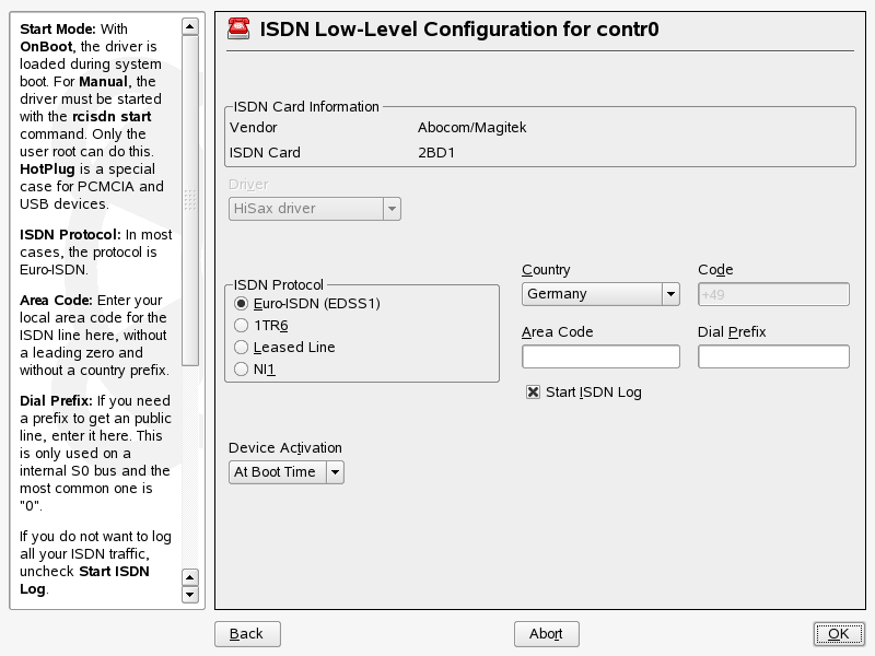 裝置啟動可定義 ISDN 介面的啟動方式:開機讓 ISDN 驅動程式在每次系統開機時起始。手動要求您以 root 身分使用 rcisdn start 指令來載入 ISDN 驅動程式。熱插用於 PCMCIA 或 USB 設備,會在插入設備後載入驅動程式。完成上述設定之後,請選取確定