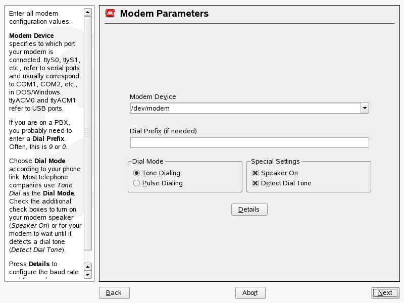 詳細資料下,設定傳輸速率和數據機的啟始字串。 只有在無法自動偵測您的數據機或是數據機需要特殊設定來傳輸資料時,才能變更這些設定。 這些設定主要適用於 ISDN 終端機介面卡。 按一下確定來結束此對話方塊。 如果要在沒有 root 許可權的情況下將數據機控制權委託給一般使用者,請啟用使用者控制。使用此方式,使用者即可啟用和停用介面,而不需要管理員的許可。 在撥號前置號碼一般表示式下,指定一個一般表示式。 KInternet 中的撥號前置號碼(一般使用者均可修改),必須符合此一般表示式。如果此欄位為空白,則使用者必須有管理員許可才能設定不同的撥號前置號碼
