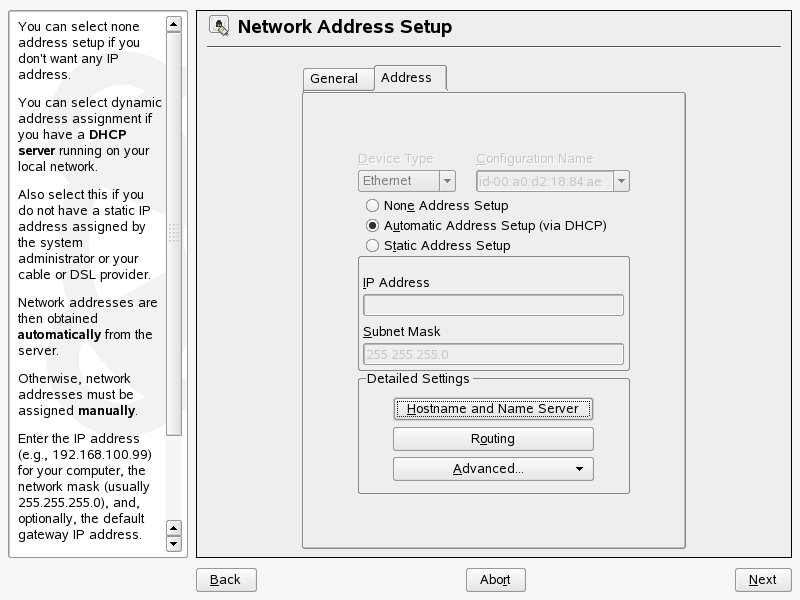 PPPoE 或 PPTP 類型的 DSL 連線組態,會要求對應的網路卡必須正確設定。 如果您尚未完成此步驟,請先選取設定網路卡來進行設定 (請參閱 節 30.4.1, 使用 YaST 設定網路卡)。 如果是 DSL 連線,會自動指定位址但不是透過 DHCP,因此您不可啟用自動位址設定 (透過 DHCP)選項, 而是應該輸入介面的靜態虛擬位址,例如 192.168.22.1。 在子網路遮罩中,輸入 255.255.255.0。 如果您要設定獨立的工作站,則應保留 預設閘道 為空白。