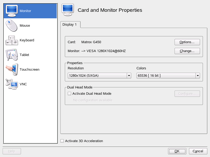 若您的圖形介面卡在電腦上安裝了兩個輸出,則您可在系統上連接兩個螢幕。當兩個螢幕連接到相同圖形介面卡時,就稱為雙螢幕顯示。SaX2 會自動偵測系統中的多顯示設備,並據此備妥組態。若要使用圖形介面卡的雙螢幕顯示模式,請選取對話方塊底部的,並按一下來設定雙螢幕顯示選項,並在雙螢幕顯示對話方塊中設定其排列方式。