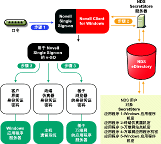 有关 NSSO 工作流程的图解说明,请参阅 1999 年 11月版 AppNotes 的 "Novell Single Sign-on"。