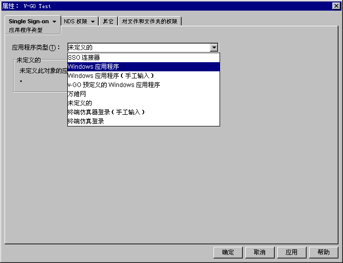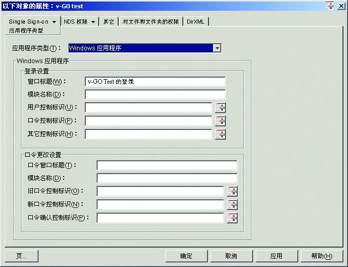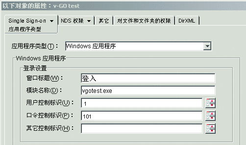 ConsoleOne 和 nssoApplication 对象的属性页打开时,起动要添加的 Windows 应用程序以显示其登录对话框。