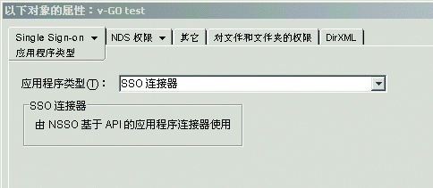 可以集中配置应用程序以获得 v-GO 的支持。 通过在 ConsoleOne 内创建 nssoApplication 对象可以执行该操作。 然后,NSSO 系统自动将数据推出给受此对象影响的所有用户。
