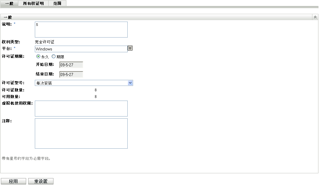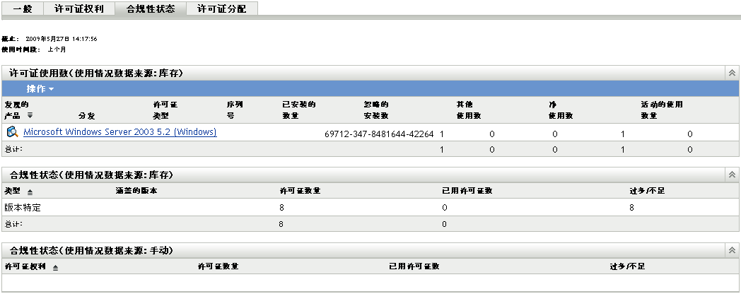 以下几节中对各个页面(“一般”、“许可证权利”、“合规性状态”及“许可证分配”)进行了说明: