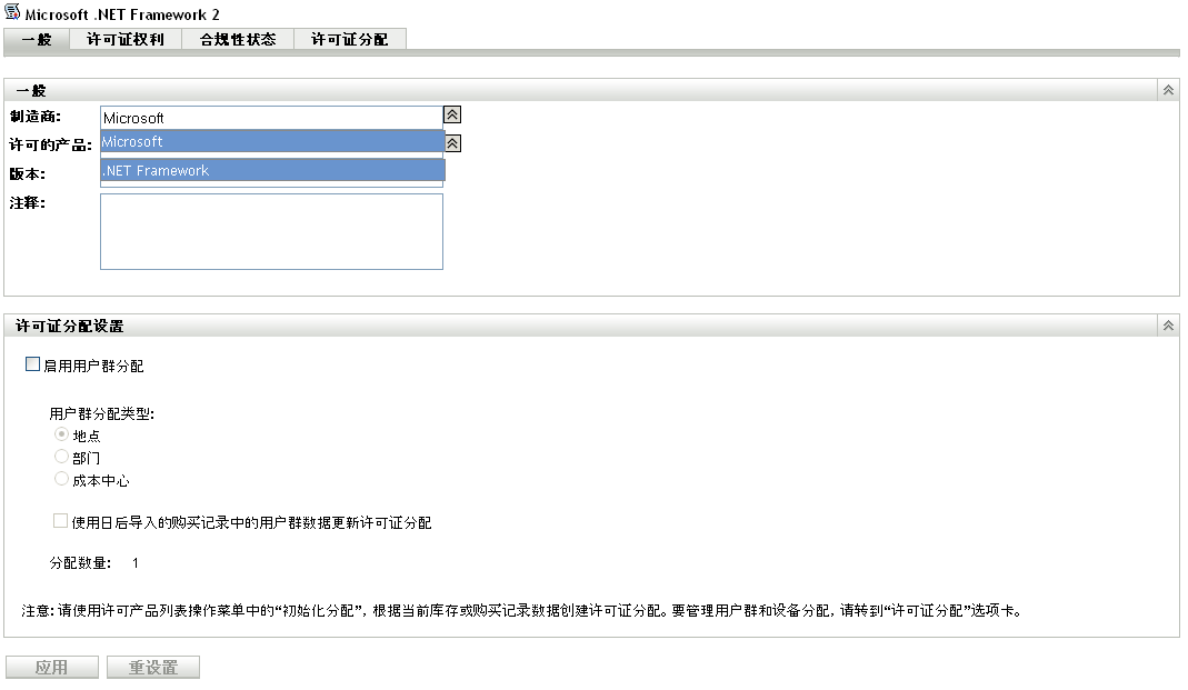 “一般”页可让您查看有关许可产品的一般信息,并可配置许可证是否支持用户群分配。