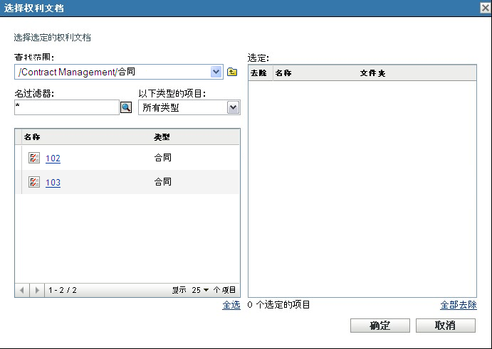 在“选择权利文档”对话框中,指定合同,然后单击。