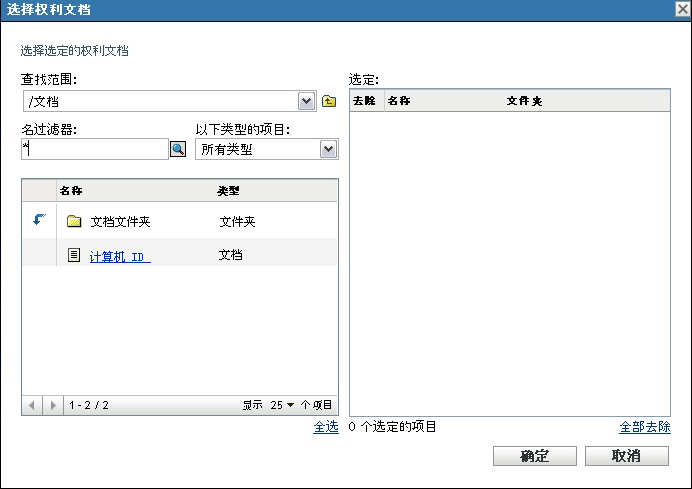 在“选择权利文档”对话框中,指定文档,然后单击。