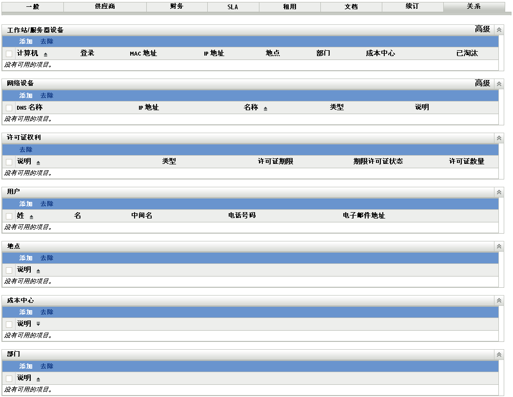 选项卡可让您将合同与以下项目相关联: