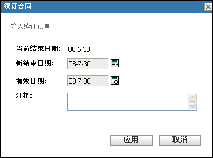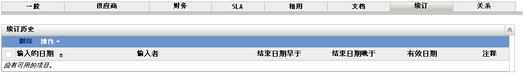 选项卡显示合同的续订历史,并可让您添加和删除续订记录。