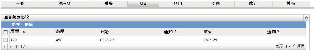 选项卡可让您创建和删除服务级别协议。
