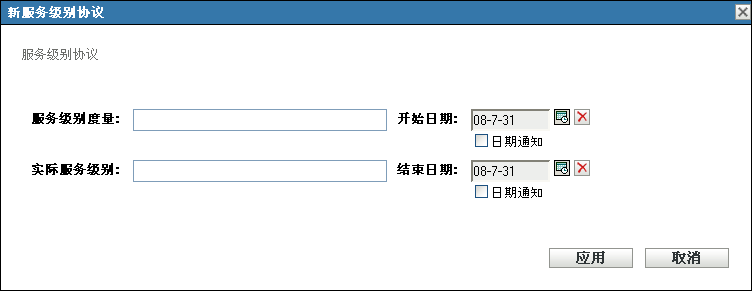在对话框中,指定服务级别度量和实际服务级别,并选择开始日期和结束日期。