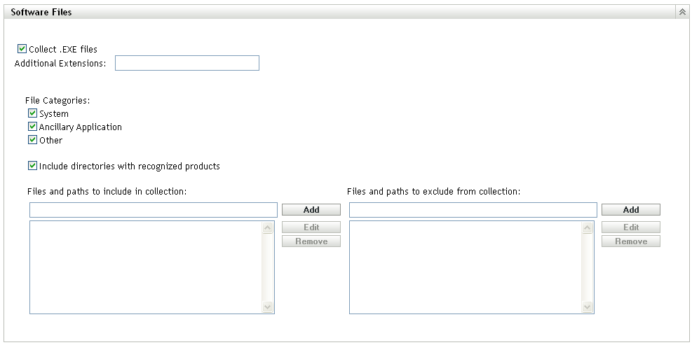 收集软件文件信息: 如果要扫描软件文件信息(可用于标识“ZENworks 知识库”未识别的软件产品),则选择此选项。如果计划创建“本地软件产品”并将这些产品添加到知识库,则必须选择此选项。更多信息请参见部分 6.0, 创建本地软件产品。