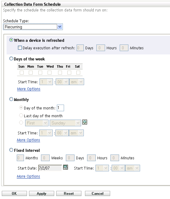 选择是在设备刷新时、一周中的特定几天、每月,还是以固定间隔部署“集合数据表单”。