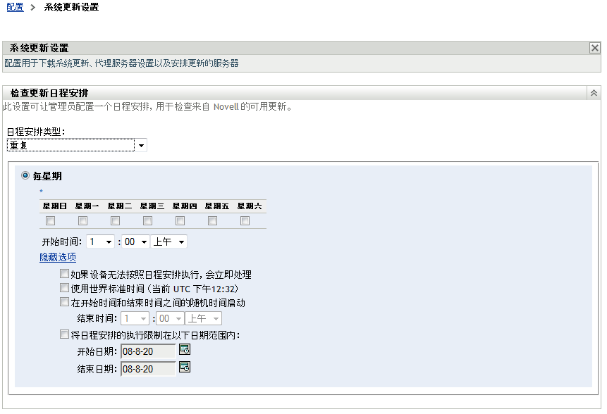 您可以指定检查更新的频率。如果执行此操作,当触发日程安排时,可用更新的相关信息会自动从 Novell® 下载到选项卡的“可用的系统更新”面板中。这不会下载更新内容本身。您可以在“下载日程安排”面板中安排下载(请参见下载日程安排)。
