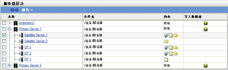 如果启用了一个或多个角色,则“从属设备”的角色图标会添加到“服务器层次”面板中的列中。