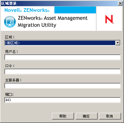 选择区域字段显示迁移目标,即 ZENworks 10 Configuration Management 的管理区域。单击字段右侧的按钮可打开区域登录对话框,您可在此处选择目标数据库。