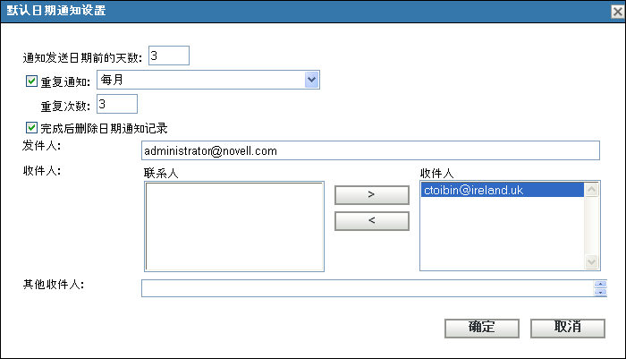 其他收件人: 必须至少添加一个默认收件人。可以使用此字段或字段来添加。要使用此字段,请至少指定一个地址(例如 pjones@novell.com)。使用逗号分隔地址。