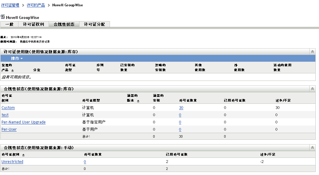 此面板显示使用库存安装数据的所有权利的合规性状态。