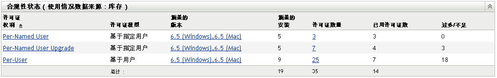 过多/不足: 显示许可证合规性状态。0 表示使用的许可证数(已用许可证数)等于可用的许可证数(许可证数量)。负数表示已用许可证数超过可用许可证数(许可证不足)。正数表示可用许可证数超过已用许可证数(许可证过多)。