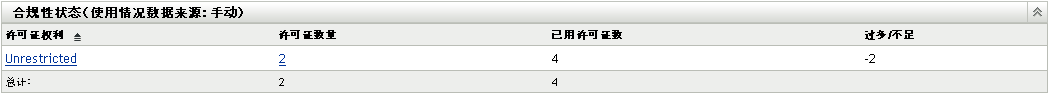 遵从性状态(使用情况数据来源:手动) 显示使用手动输入的安装数据的所有权利的合规性状态。