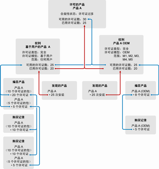 在此例中,“产品 A”(发现的产品)与两种权利都关联。其中的五个安装(分别在 M1、M2、M3、M4 和 M5 上)使用“产品 A OEM”权利中的许可证,另外的 20 个安装使用“产品 A 基于用户”权利中的许可证。