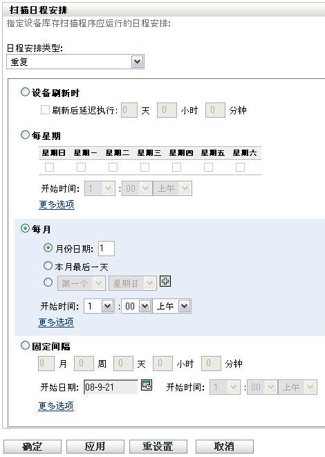 选择是要扫描在设备刷新时运行、在一周中的某几天运行还是以固定间隔运行。