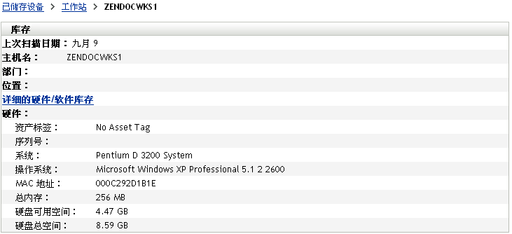 此报告显示了设备的详细信息,包括用户群数据、硬件以及软件信息。您可以在此页中单击各链接以获取更多详细信息。报告可以导出为 Excel、CSV 或 PDF 格式。您还可以编辑用户群数据。有关详细信息,请参见部分 2.5, 编辑受管设备的库存数据。