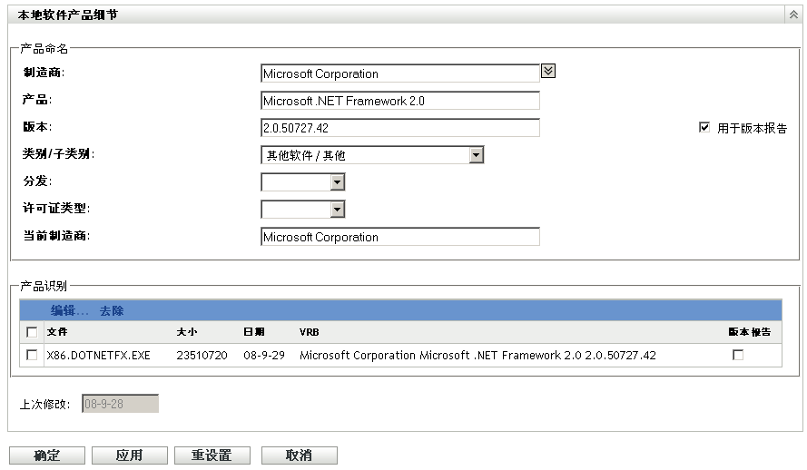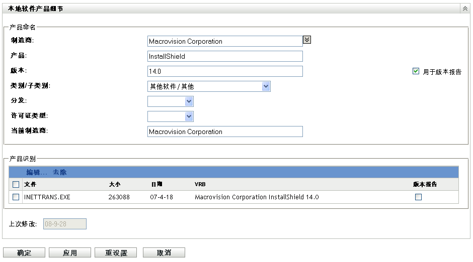 “本地软件产品细节”页显示本地软件产品以及用于识别该产品的文件的有关细节。您可以在此处编辑产品信息或用于识别文件的“版本识别块”(VRB) 数据。如果与产品关联的文件不包含“版本资源块”(VRB) 信息,则字段会显示“未命名”。