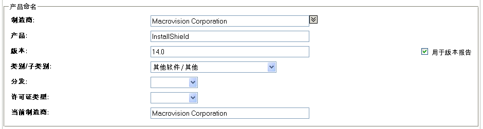 用于版本报告: 选择用于版本报告可以通过产品版本来识别。您可以使用产品版本或文件版本进行识别。如果要在版本字段中指定要用于产品定义的版本,请指定值然后选择用于版本报告。可以使用产品版本或文件版本进行标识。要使用文件版本,请在“产品识别”部分中选择版本报告