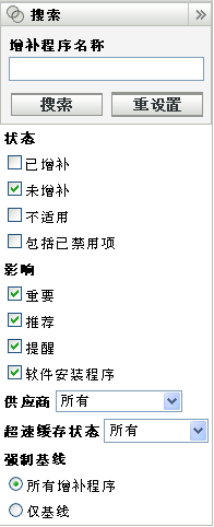 “设备组增补程序”页上的面板(如图 6-1中所示)可让您搜索强制基线增补程序。面板还可让您根据增补程序的状态和影响搜索其他增补程序。
