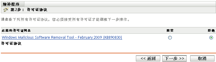 “许可证协议”页显示与所选增补程序相关的所有第三方许可信息。安排所选增补程序的部署的第二步,是接受或拒绝该增补程序的许可证协议。