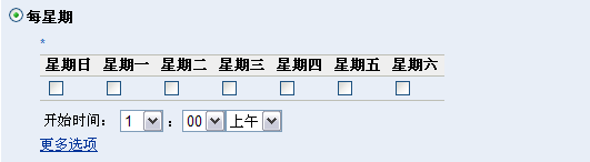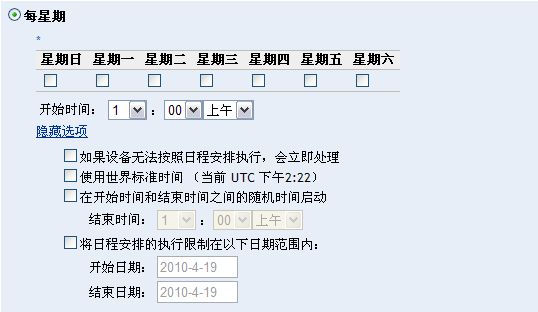 要设置部署日期,请选中按钮,再选中每周所需的日期,然后设置部署的开始时间。如果单击链接,将显示其他部署选项,如下图所示:单击链接以隐藏其他部署选项,并仅显示默认的部署选项:
