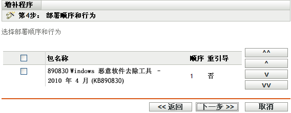 使用“部署更新向导”的“部署顺序和行为”页,可以设置每个部署日程安排的顺序和行为。安排所选增补程序的部署的第四步,是设置所选增补程序的部署顺序和行为。