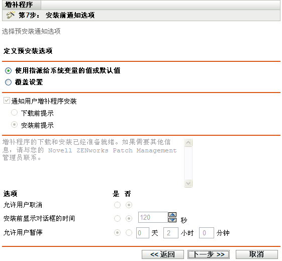“部署更新”向导的“预安装通知选项”页可让您定义在下载并安装增补程序时用户是否会收到通知,并可让您自定义通知。安排所选增补程序的部署的第七步,是设置通知和允许用户取消选项。
