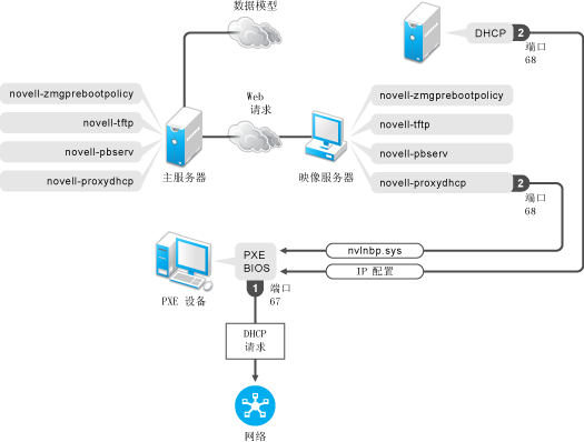 DHCP 服务器在端口 68 上以 IP 配置信息进行响应,而映像从属设备上的 Proxy DHCP 服务器在端口 68 上以引导程序的名称 (nvlnbp.sys) 和 TFTP 服务或守护程序所在位置的 IP 地址进行响应。