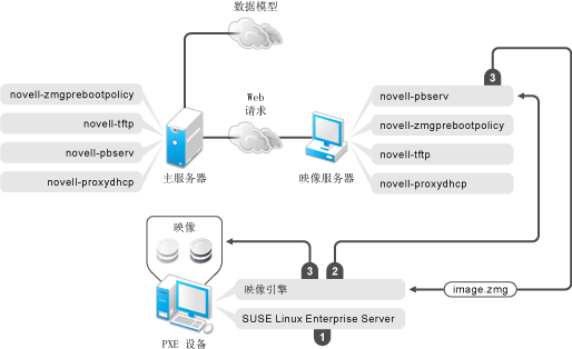 以下几节说明预引导服务如何针对 PXE 引导、ZENworks Imaging和映像从属设备上的第三方映像执行工作:
