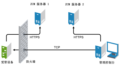 在这种方式中,远程会话由管理控制台上的管理员启动。管理控制台通常放置于企业网络内,受管设备则可以置于企业网络内部或外部。下图说明了从管理控制台启动的受管设备上的远程会话。