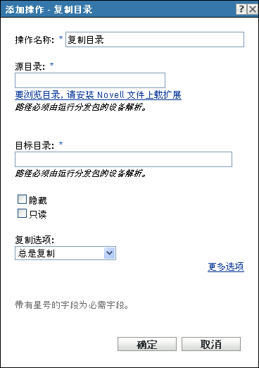 注:复制文件或目录只会将该文件或目录从一个位置复制到另一个位置,不会将文件上载到 ZENworks 内容储存库。复制文件或目录是不使用内容进行复制的操作。复制文件或目录时,受管设备会执行复制操作,且设备必须能解析源路径和目标路径。此外,复制文件或目录时,文件或目录不会在受管设备上超速缓存。