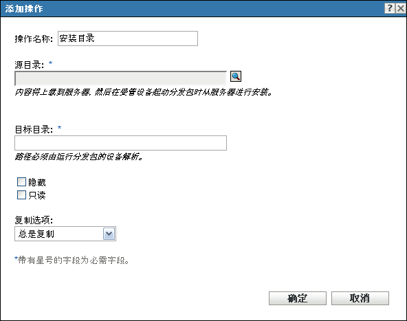 “操作 - 安装目录”对话框可让您指定要安装的目录、目标路径、在设备上安装目录后将该目录设置为隐藏还是只读,以及指定复制选项。还可以使用此页安装 Novell 文件上载扩展,如此才能浏览目录。