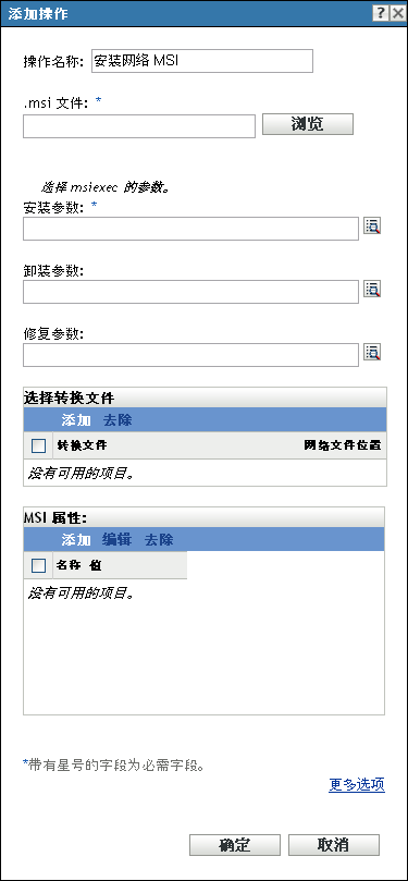 “操作 - 安装网络 MSI”对话框可让您指定 MSI 文件的位置;MSI 的“安装”、“卸装”和“修复”参数;转换文件;以及可执行文件的安全性级别。