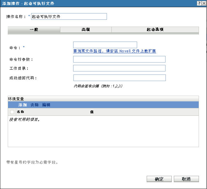 “添加操作 - 起动 可执行文件”对话框可让您指定 Windows 可执行文件、命令行参数和其他可选设置。
