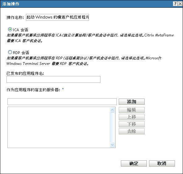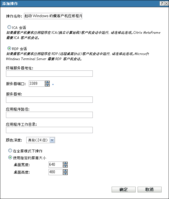 “操作 - 起动 Windows 的瘦客户机应用程序”对话框可让您指定起动 ICA(独立计算结构)或起动 RDP(远程桌面协议)客户机会话,并配置适当的设置。