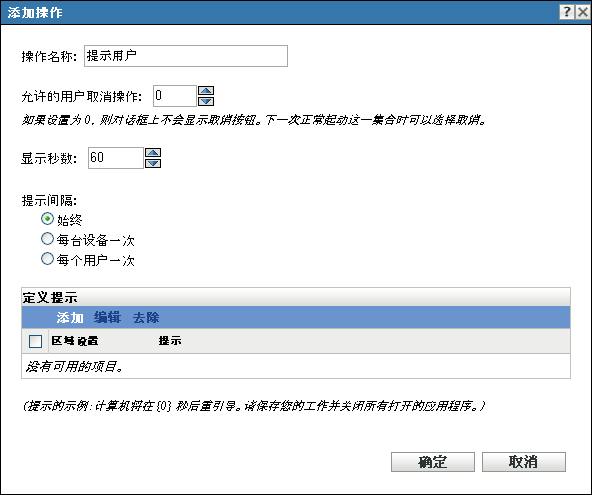 显示秒数: 指定执行操作前,显示提示的秒数。例如,假设您配置了一个提示,让其在应用程序安装期间于设备执行必要的重引导之前显示。如果您指定用户可以取消操作集,并且指定提示显示 10 秒,那么提示显示 10 秒后设备就会重引导。