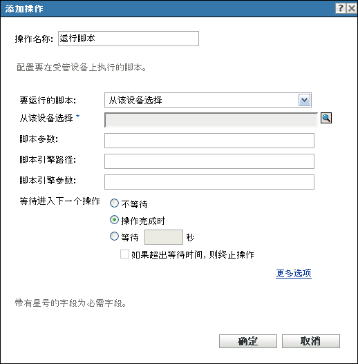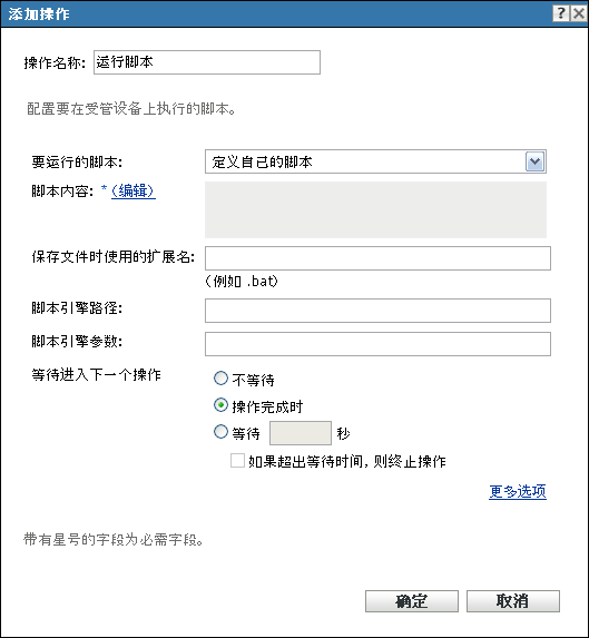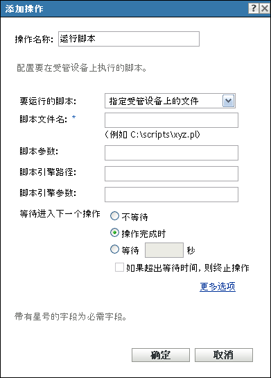 “操作 - 运行脚本”对话框可让您配置要在受管设备上执行的脚本。要成功完成“运行脚本”操作,请确保脚本为无提示方式(无需用户介入)。