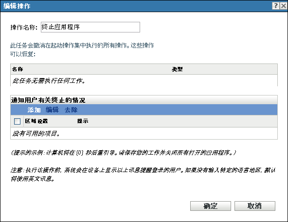 “操作 - 终止应用程序”对话框可让您撤消起动操作集中执行的所有操作。您也可以配置提示以通知用户有关终止的情况。
