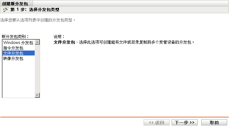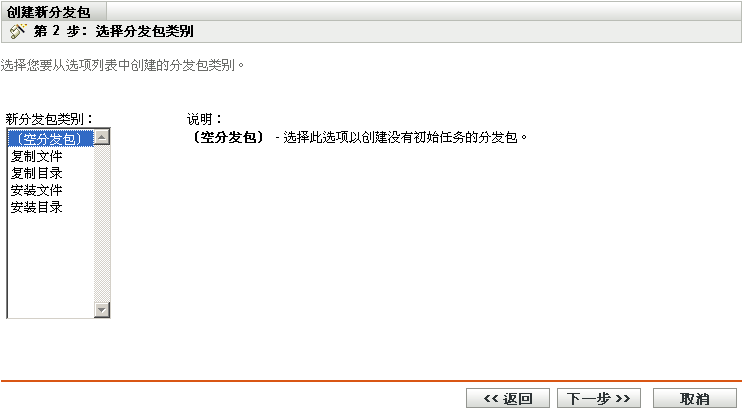 在列表中,单击,然后单击显示“选择分发包类型”页。